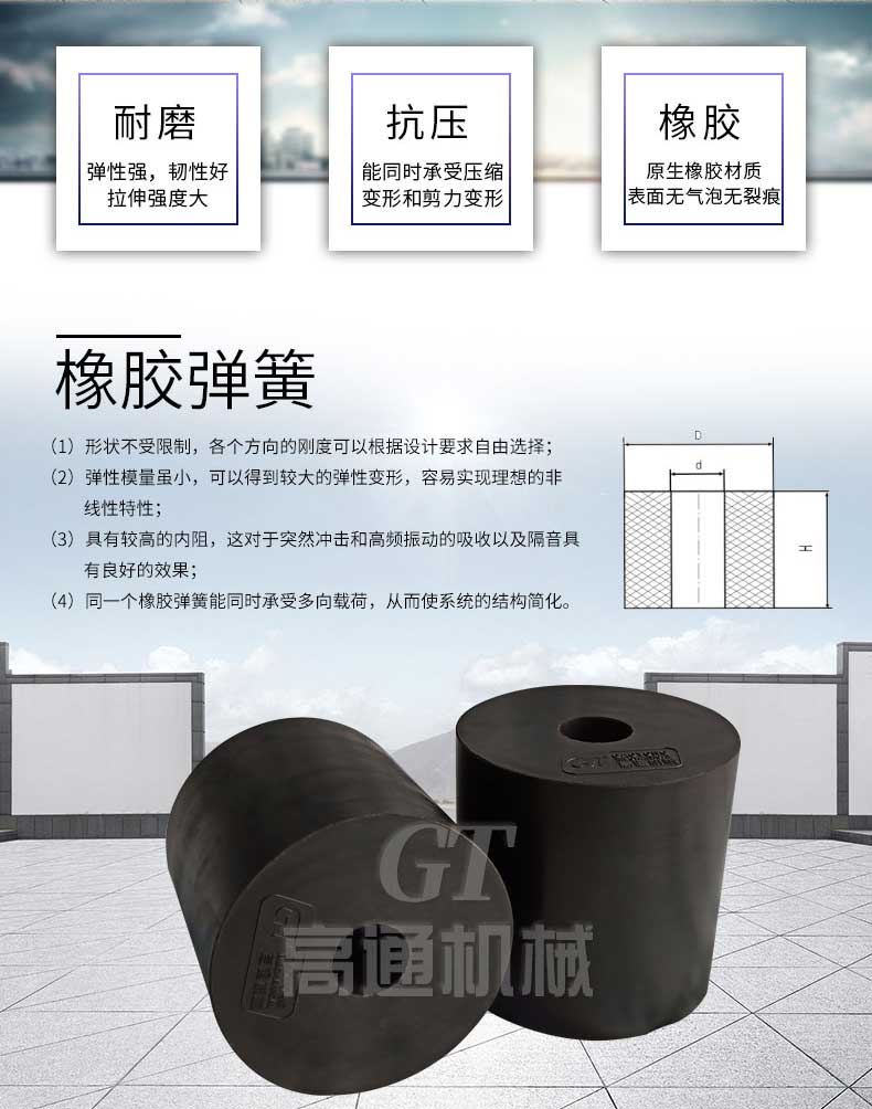 橡膠彈簧:是一種高彈性體,制作材料有普通橡膠。橡膠彈簧彈性模量小,受載后有較大的彈性變形,借以吸收沖擊和振動。它能同時受多向載荷,但耐高溫性和耐油性比鋼彈簧差。如有特殊要求可用耐油橡膠制成。該產(chǎn)品減振效果好,共振領(lǐng)域小,使用壽命長,成本低,還有良好的耐寒性,優(yōu)良的氣密性,防水性,電絕緣性,是減振的最佳選擇。