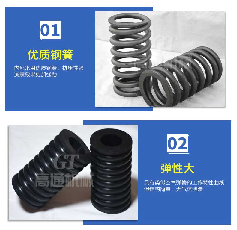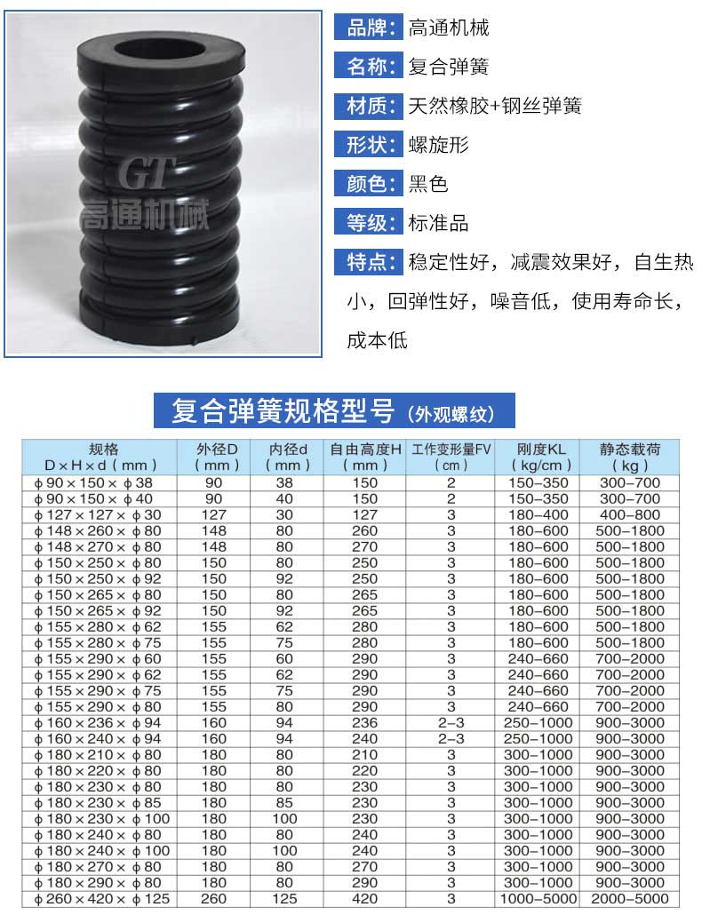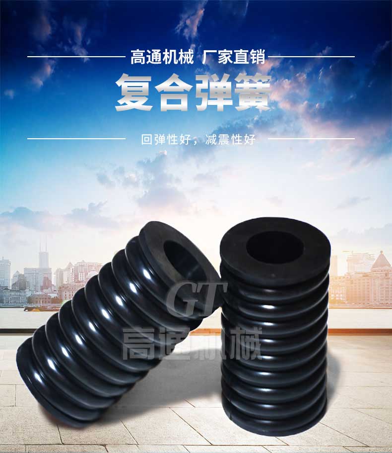 復(fù)合彈簧是由金屬螺旋彈簧和橡膠復(fù)合為一體的彈性體,集金屬彈簧和橡膠彈簧的優(yōu)點(diǎn)于一體,并克服兩者的缺點(diǎn)。形狀和機(jī)械性能穩(wěn)定,能承受載荷和大變形量。隔振降噪效果好,具有工作平穩(wěn),共振區(qū)時間短等優(yōu)點(diǎn),尤其適用于礦山、冶金、煤炭等行業(yè)的大型振動設(shè)備或大型減震設(shè)備。