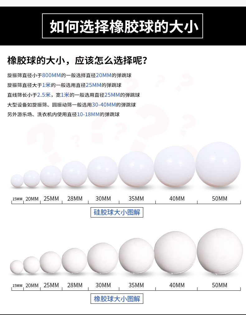 常見振動篩彈跳球的尺寸通常有Φ10、Φ15、Φ20、Φ25、Φ28、Φ30、Φ40等